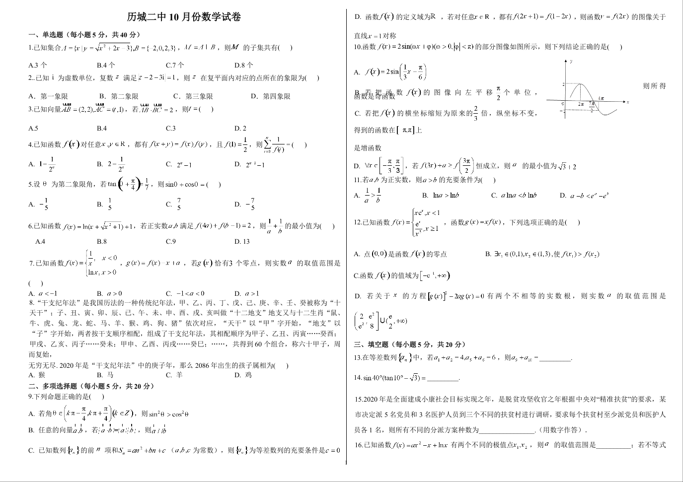 济南市历城二中2020.10高三年级学情检测数学试题及答案