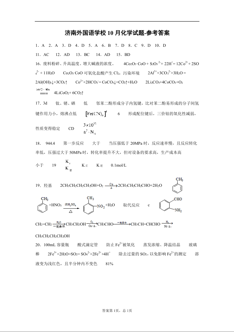 济南外国语学校2020.10高三年级质量检测化学答案