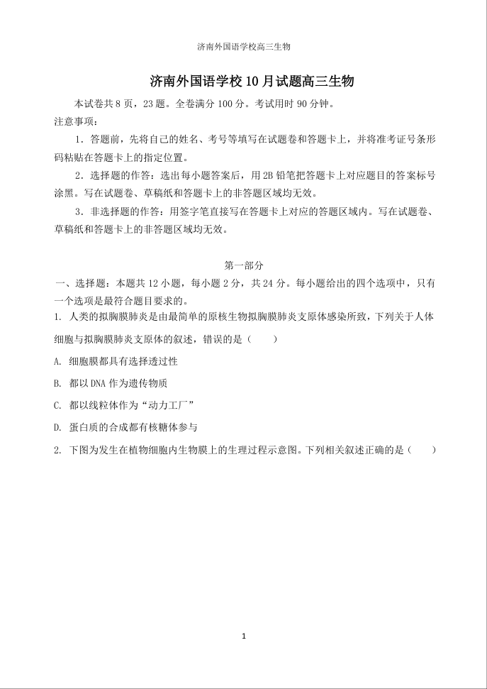 济南外国语学校2020.10高三年级质量检测生物及答案