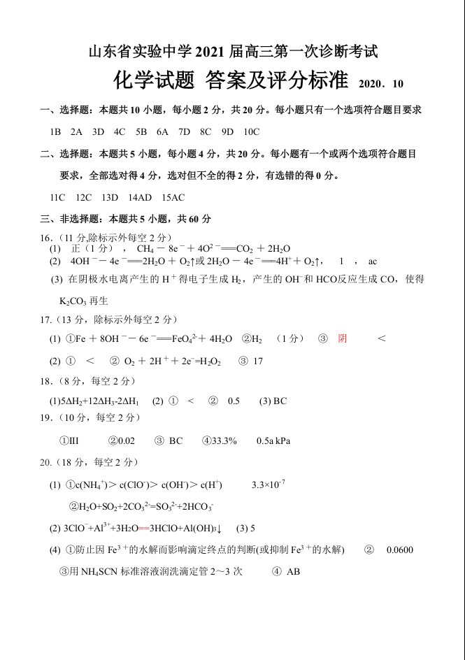山东省实验中学2020.10高三年级第一次诊断考试化学答案