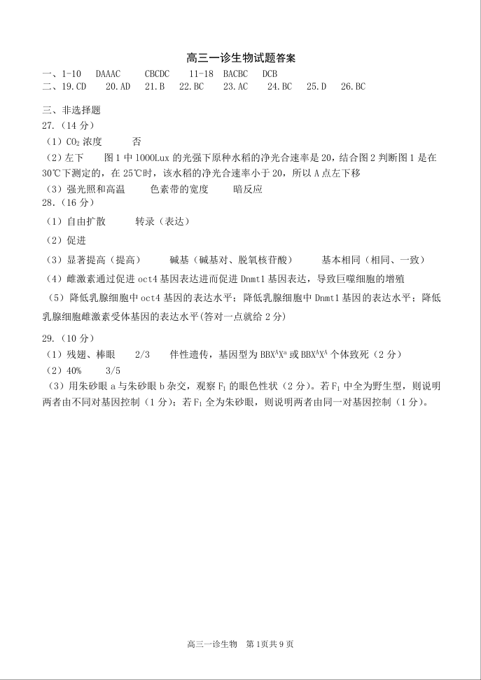 山东省实验中学2020.10高三年级第一次诊断考试生物答案