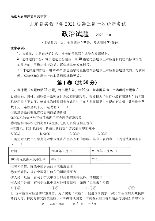 山东省实验中学2020.10高三年级第一次诊断考试政治