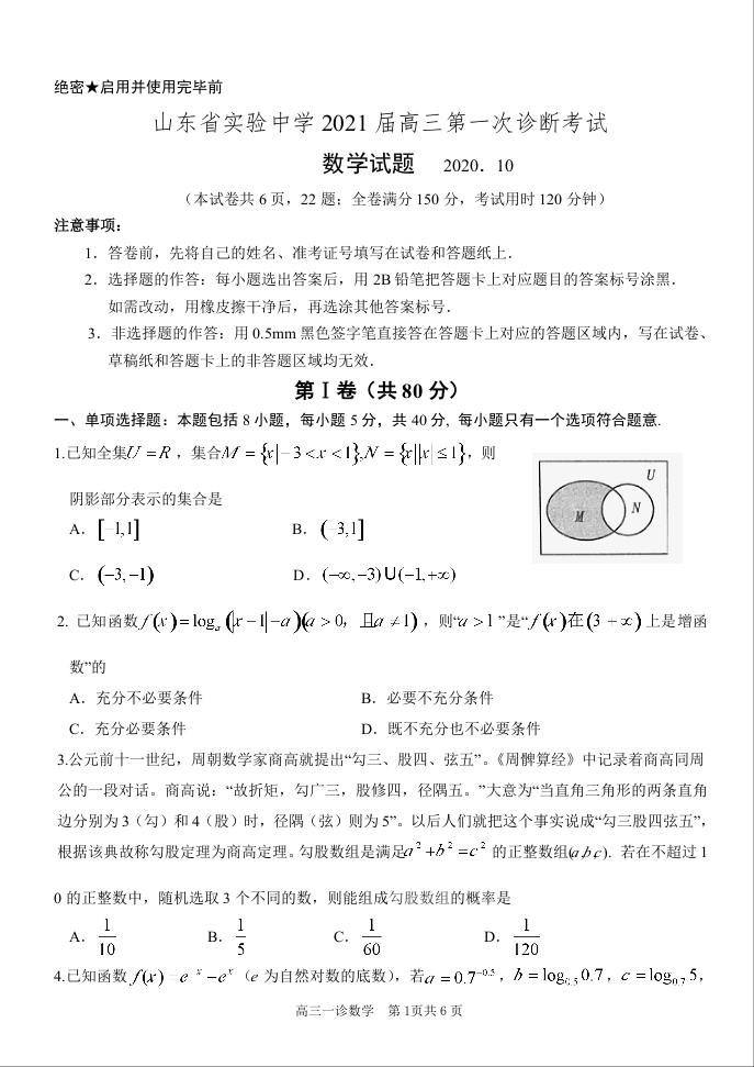 山东省实验中学2020.10高三年级第一次诊断考试数学