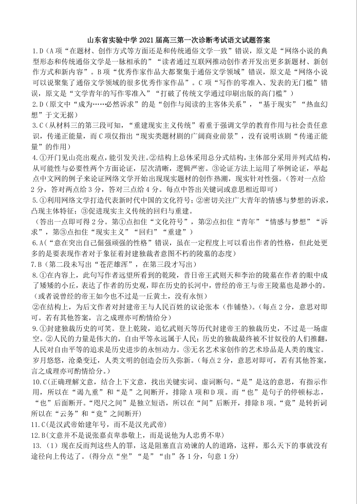 山东省实验中学2020.10高三年级第一次诊断考试语文答案