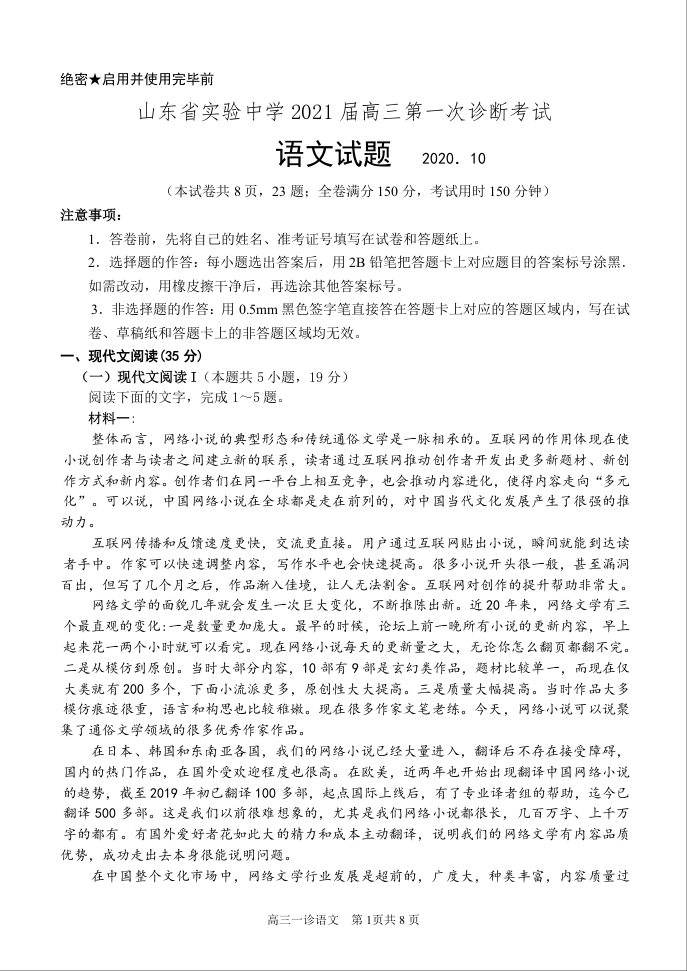 山东省实验中学2020.10高三年级第一次诊断考试语文