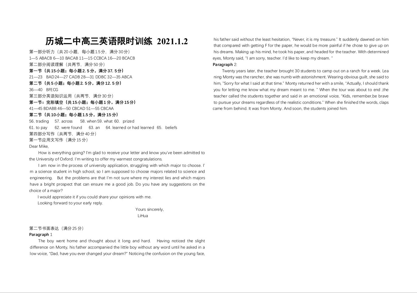济南市历城二中2021.1高三复习检测试题英语答案