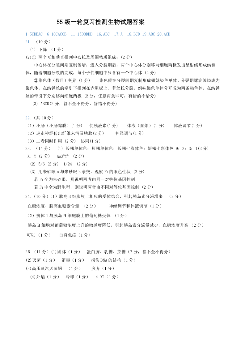 济南市历城二中2021.1高三复习检测试题生物答案