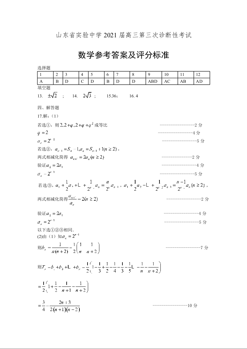 山东省实验中学2021.1高三第三次诊断考试数学答案