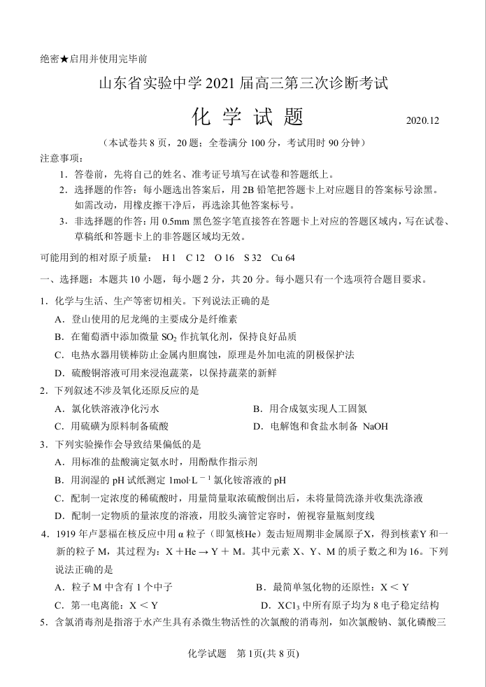 山东省实验中学2021.1高三第三次诊断考试化学