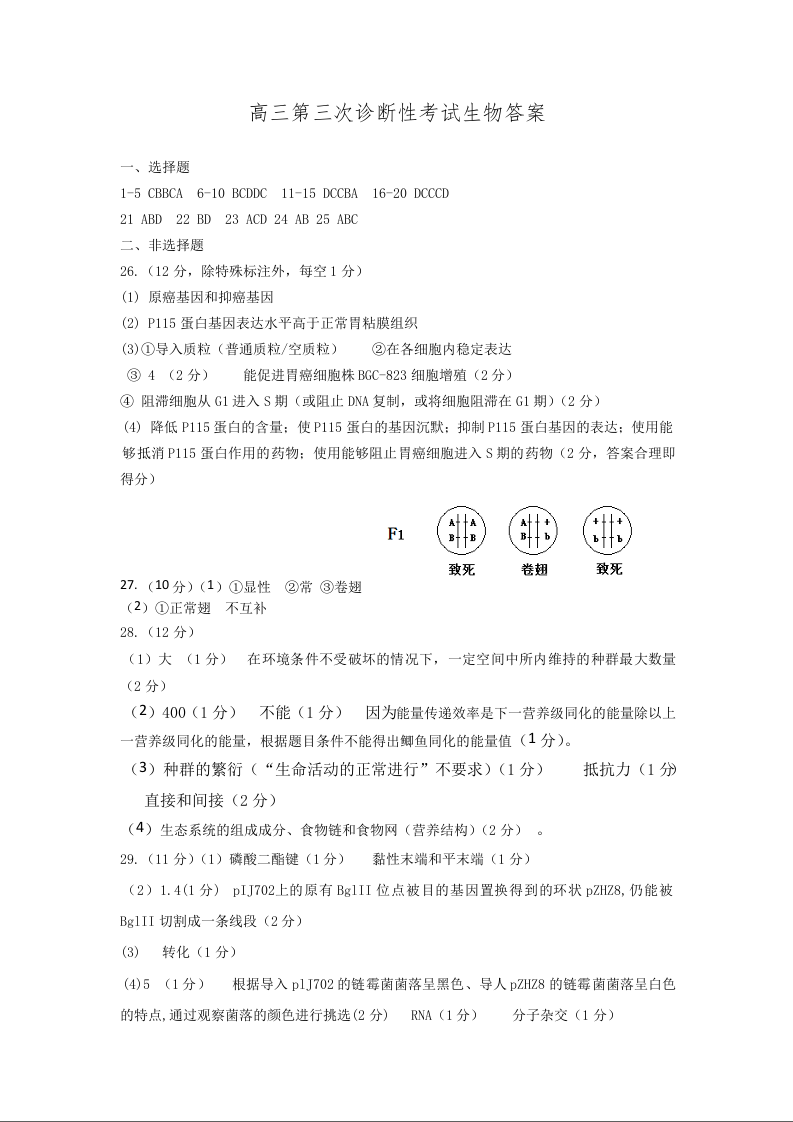 山东省实验中学2021.1高三第三次诊断考试生物答案