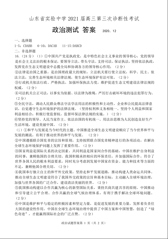 山东省实验中学2021.1高三第三次诊断考试政治答案
