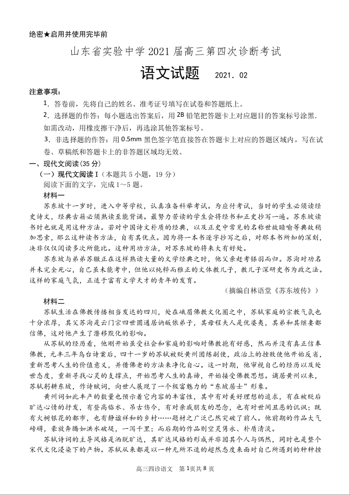 山东省实验中学2021.1高三第四次诊断考试语文