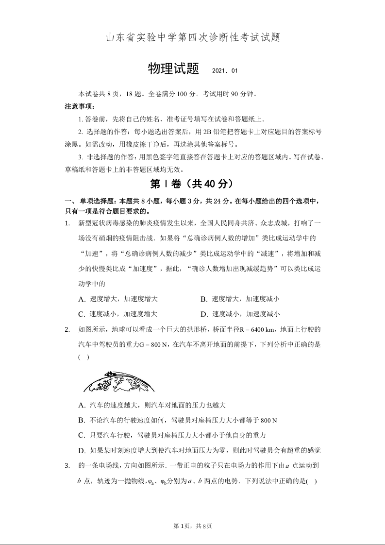 山东省实验中学2021.1高三第四次诊断考试物理