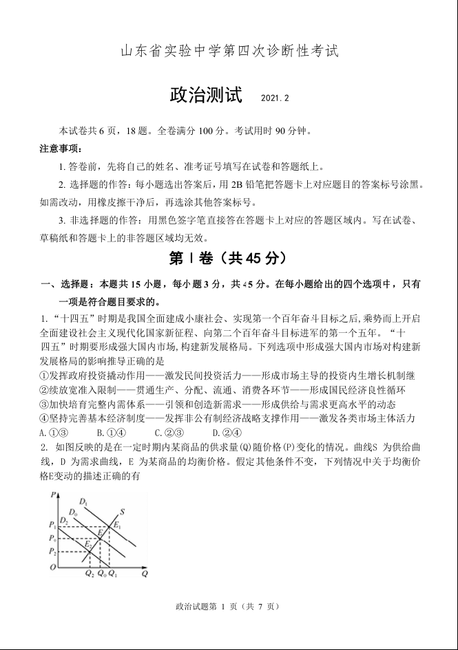 山东省实验中学2021.1高三第四次诊断考试政治