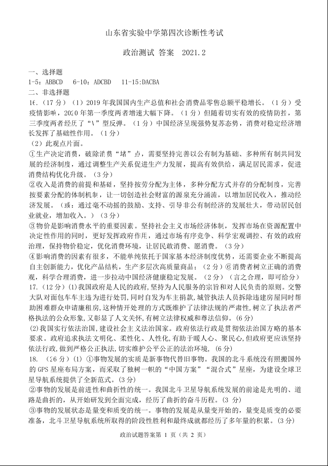 山东省实验中学2021.1高三第四次诊断考试政治答案