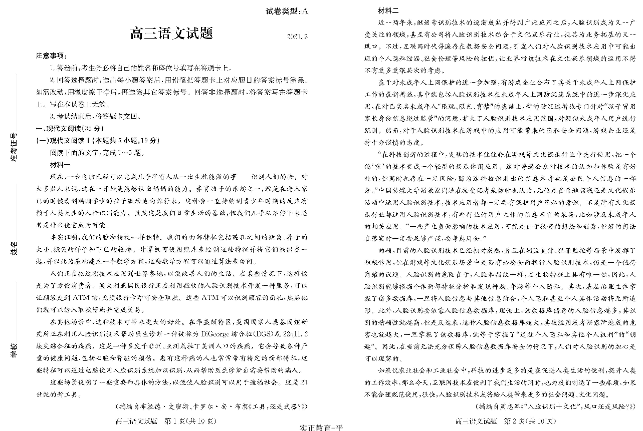山东省滨州市2021.3高三年级第一次模拟考试语文及答案