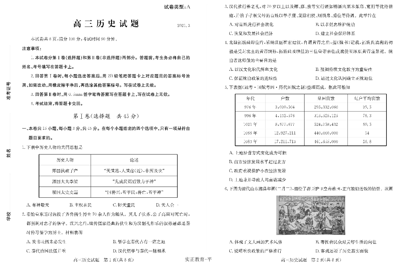 山东省滨州市2021.3高三年级第一次模拟考试历史及答案
