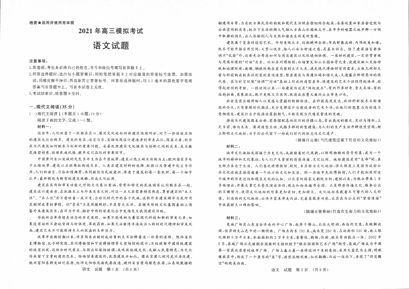 山东省济南市2021.3高三年级第一次模拟考试语文