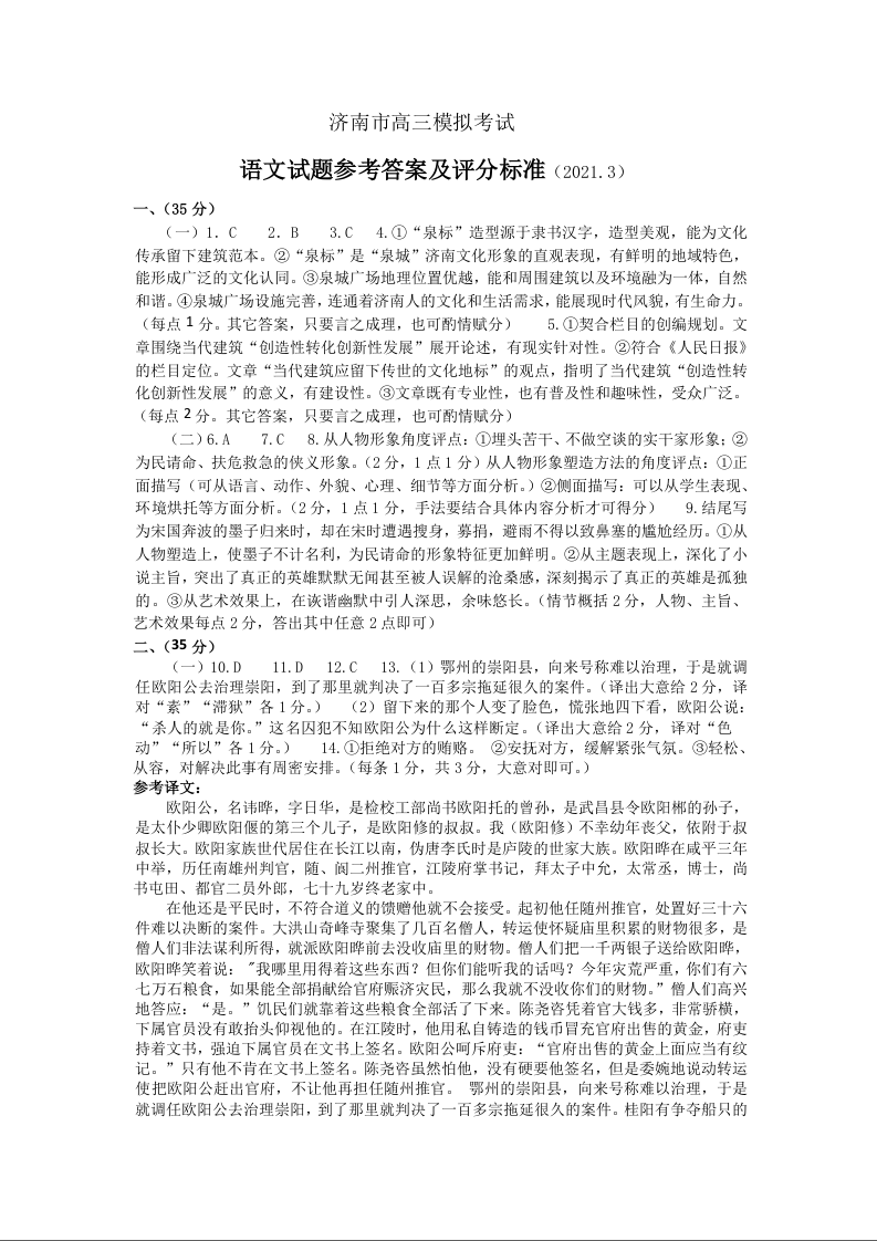 山东省济南市2021.3高三年级第一次模拟考试语文答案