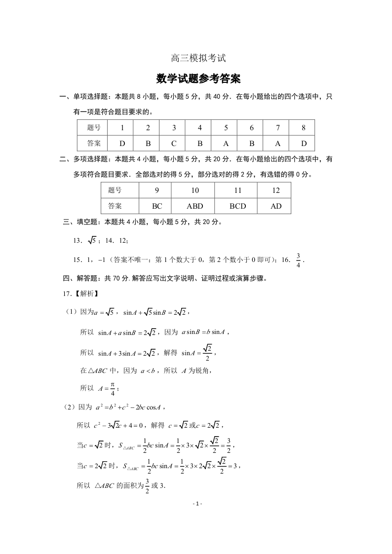 山东省济南市2021.3高三年级第一次模拟考试数学答案