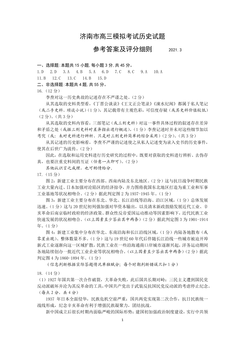 山东省济南市2021.3高三年级第一次模拟考试历史答案