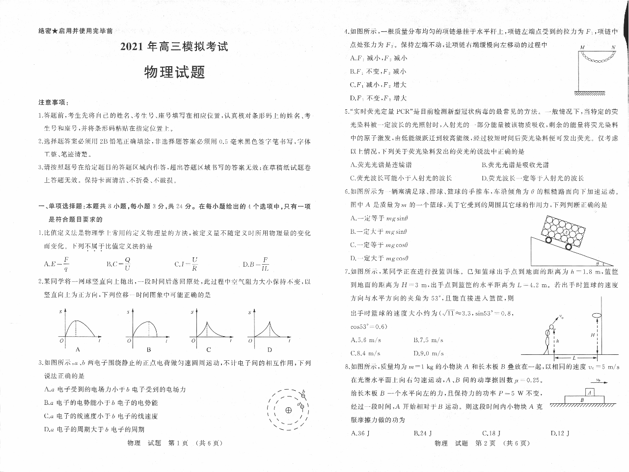 山东省济南市2021.3高三年级第一次模拟考试物理