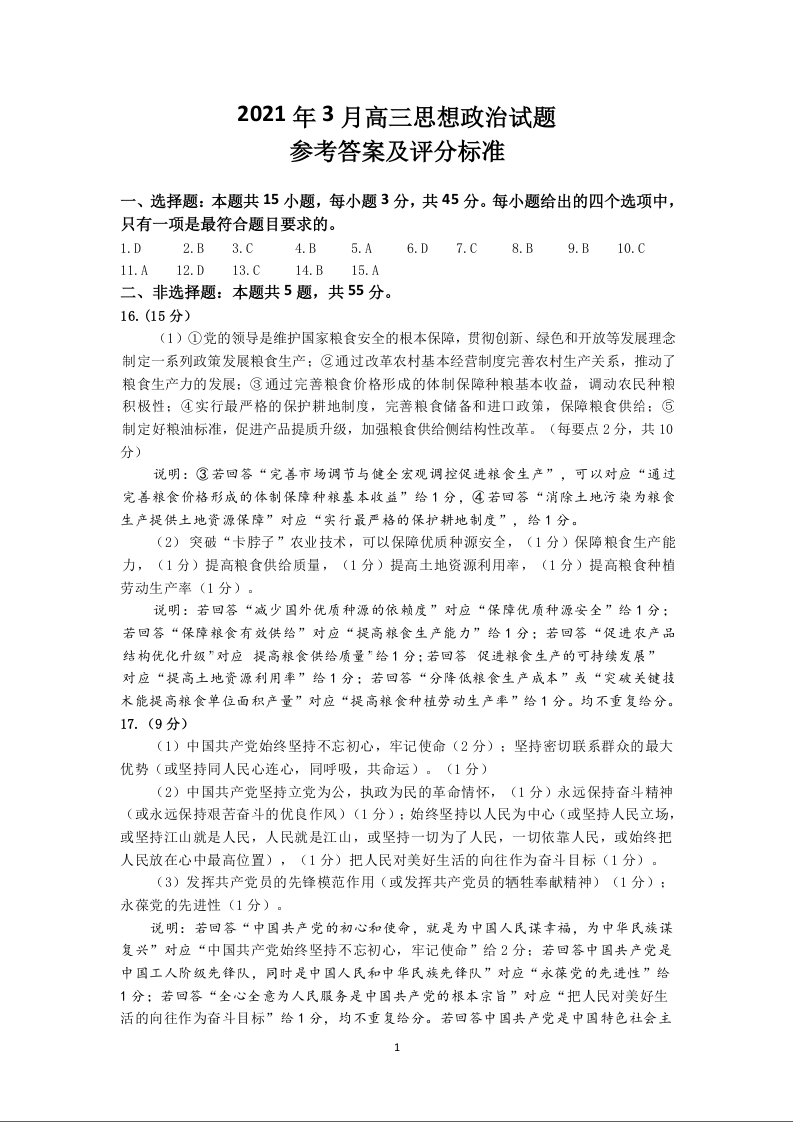 山东省济南市2021.3高三年级第一次模拟考试政治答案