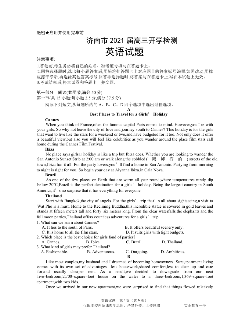 山东省济南市2021.3高三年级开学检测试题英语