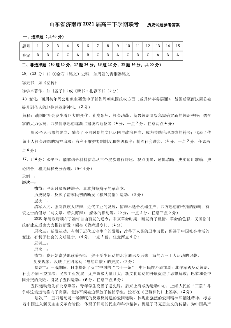 山东省济南市2021.3高三年级开学检测试题历史答案