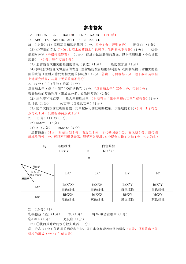 山东省济南市2021.3高三年级开学检测试题生物评分标准
