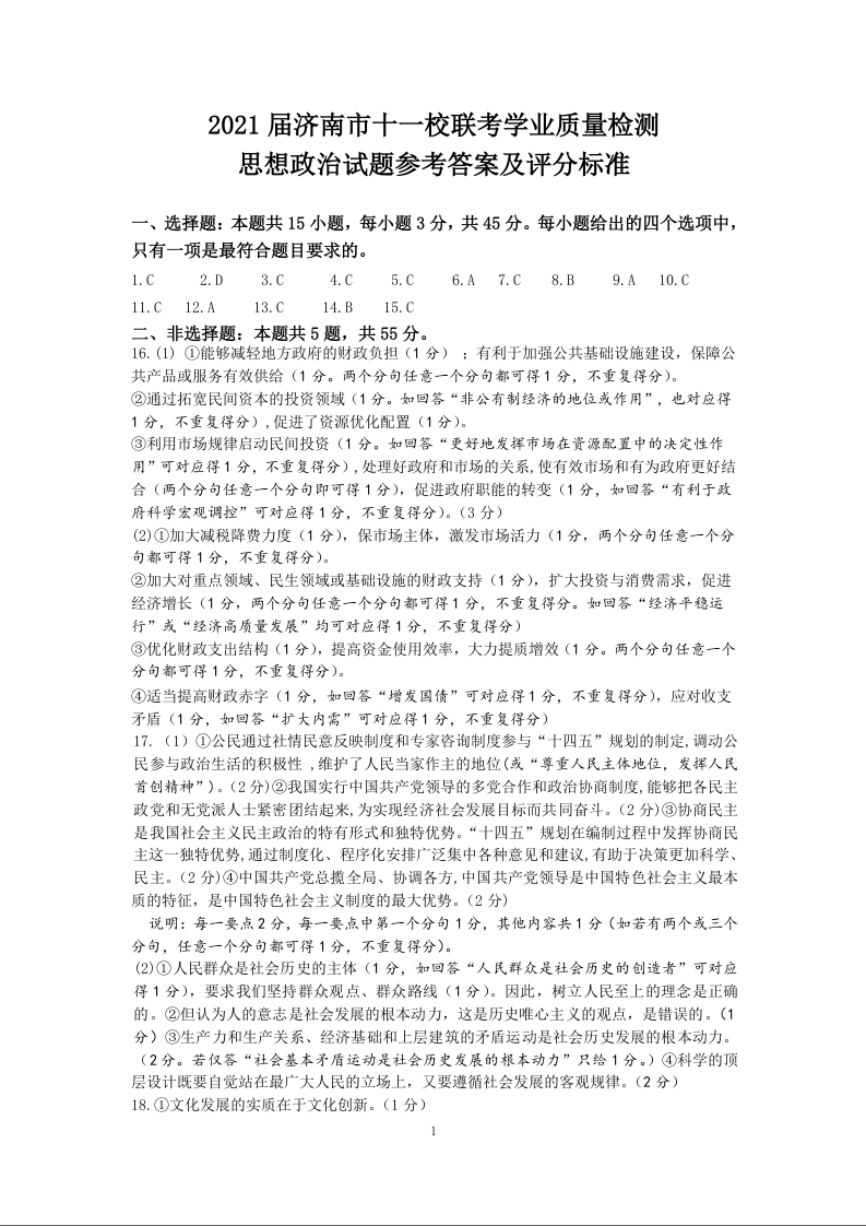 山东省济南市2021.3高三年级开学检测试题政治答案