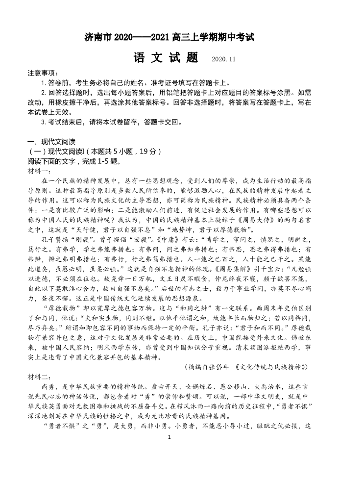 山东省济南市2020.11高三年级期中检测考试语文