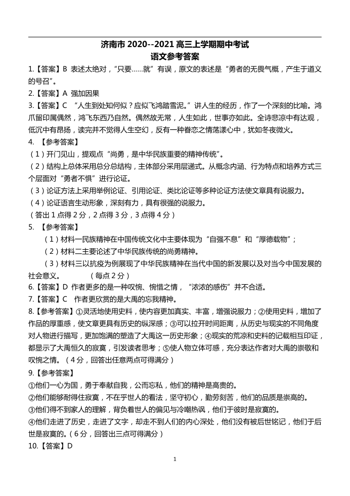山东省济南市2020.11高三年级期中检测考试语文答案