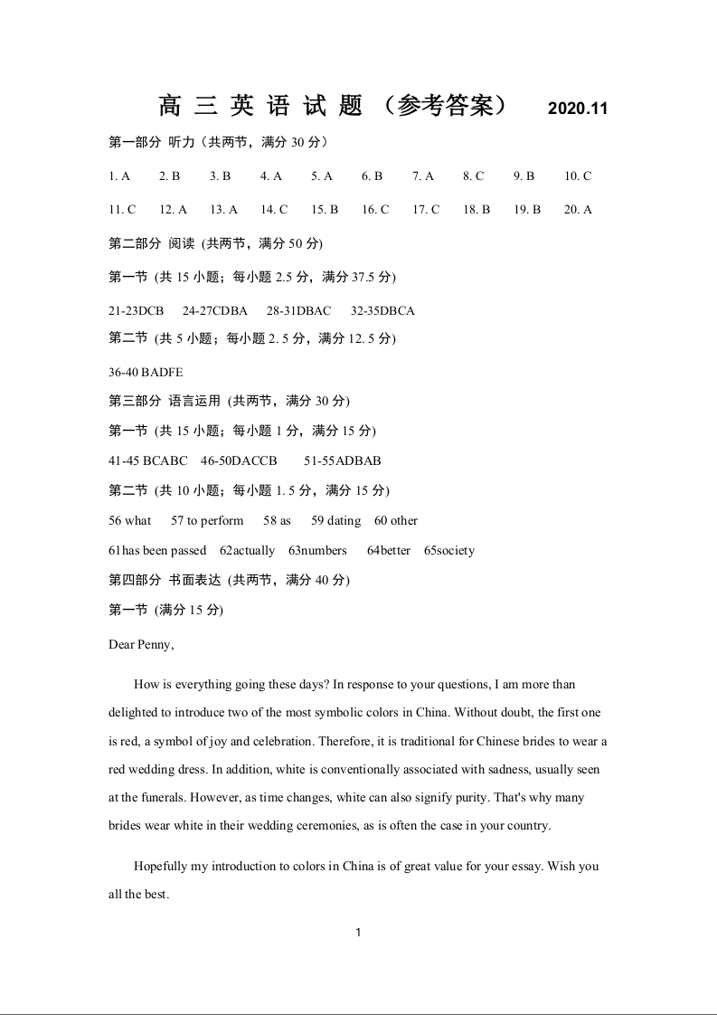 山东省济南市2020.11高三年级期中检测考试英语答案