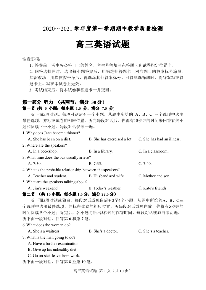山东省济宁市2020.11高三年级期中教学质量检测英语