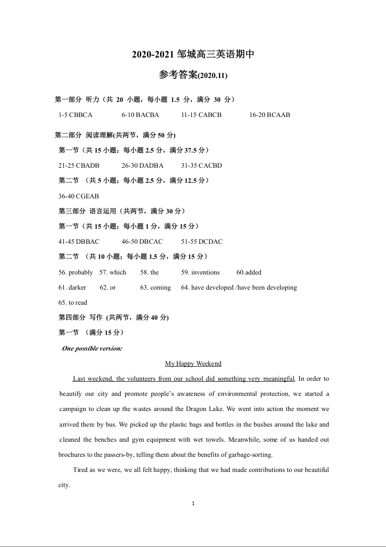 山东省济宁市2020.11高三年级期中教学质量检测英语答案