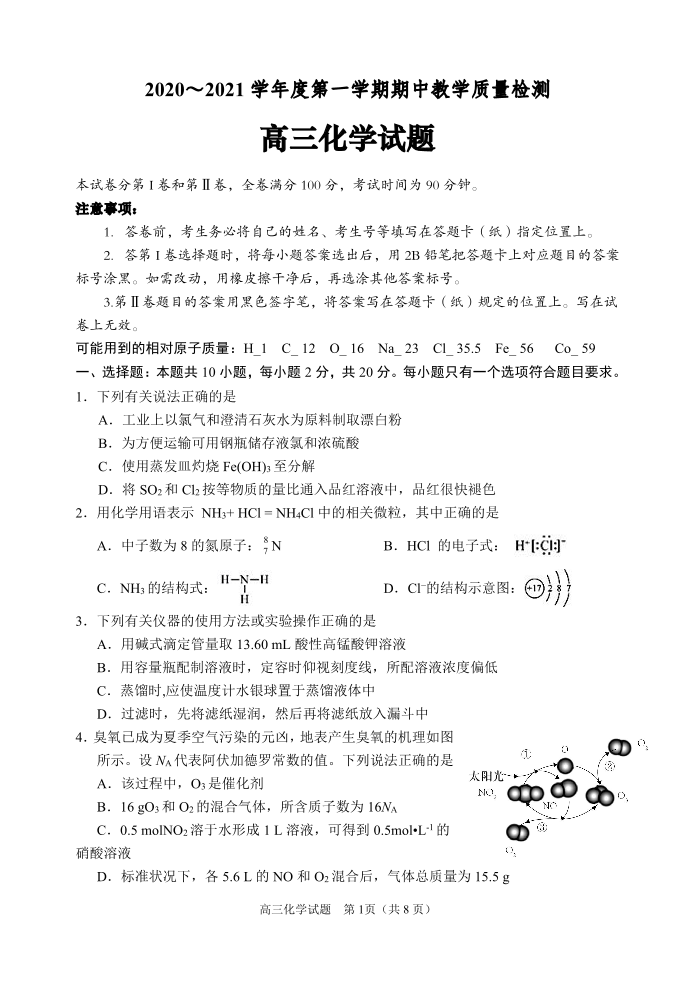 山东省济宁市2020.11高三年级期中教学质量检测化学