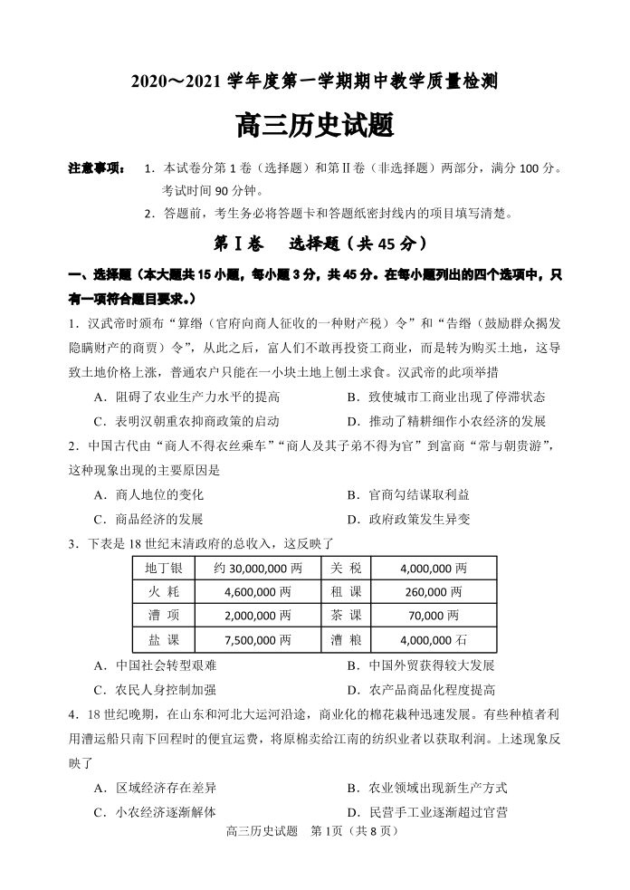 山东省济宁市2020.11高三年级期中教学质量检测历史
