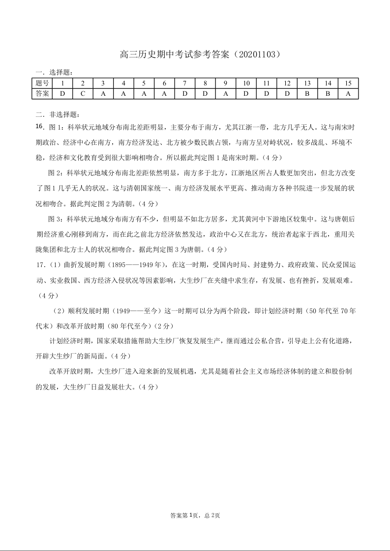 山东省济宁市2020.11高三年级期中教学质量检测历史答案