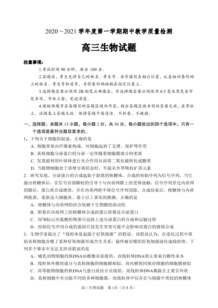 山东省济宁市2020.11高三年级期中教学质量检测生物A卷