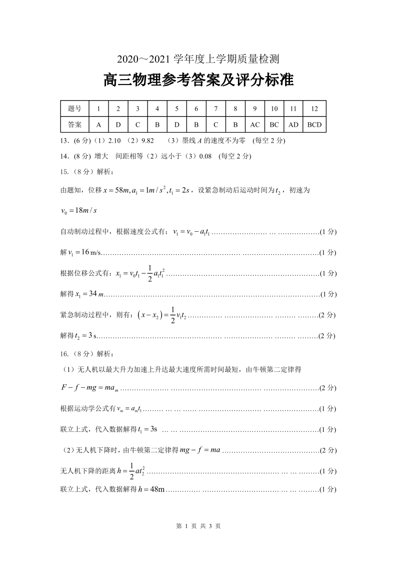 山东省济宁市2020.11高三年级期中教学质量检测物理答案