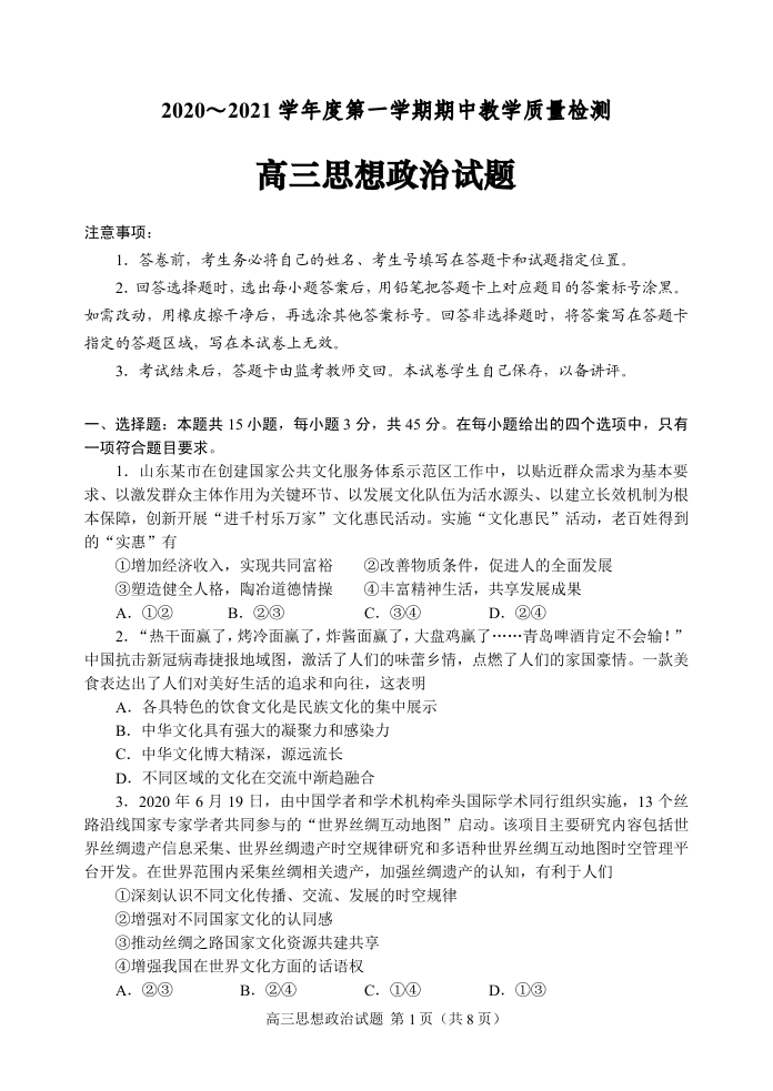 山东省济宁市2020.11高三年级期中教学质量检测政治