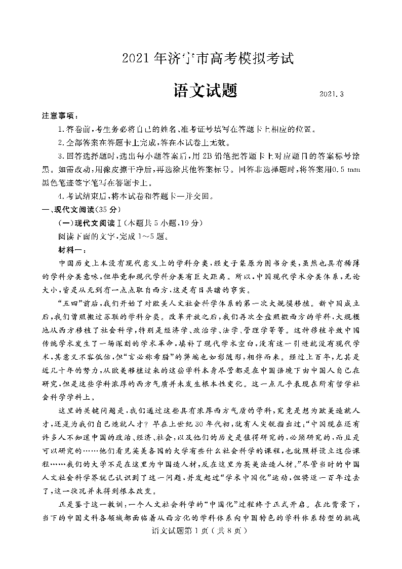 山东省济宁市2021.3高三年级第一次模拟考试语文