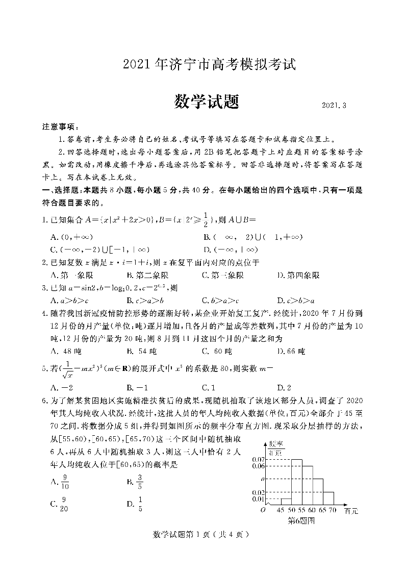 山东省济宁市2021.3高三年级第一次模拟考试数学
