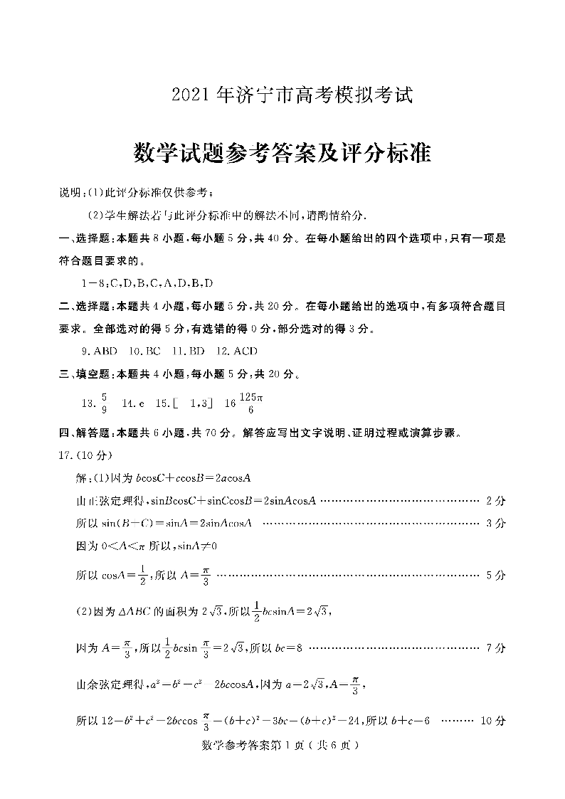 山东省济宁市2021.3高三年级第一次模拟考试数学答案