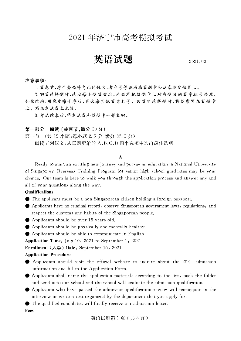 山东省济宁市2021.3高三年级第一次模拟考试英语