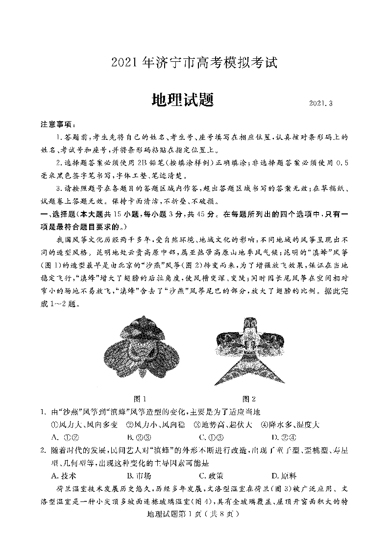 山东省济宁市2021.3高三年级第一次模拟考试地理
