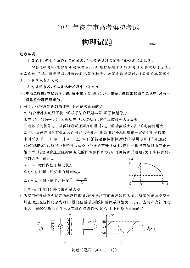 山东省济宁市2021.3高三年级第一次模拟考试物理