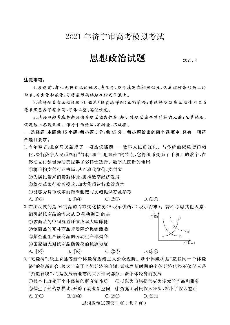 山东省济宁市2021.3高三年级第一次模拟考试政治