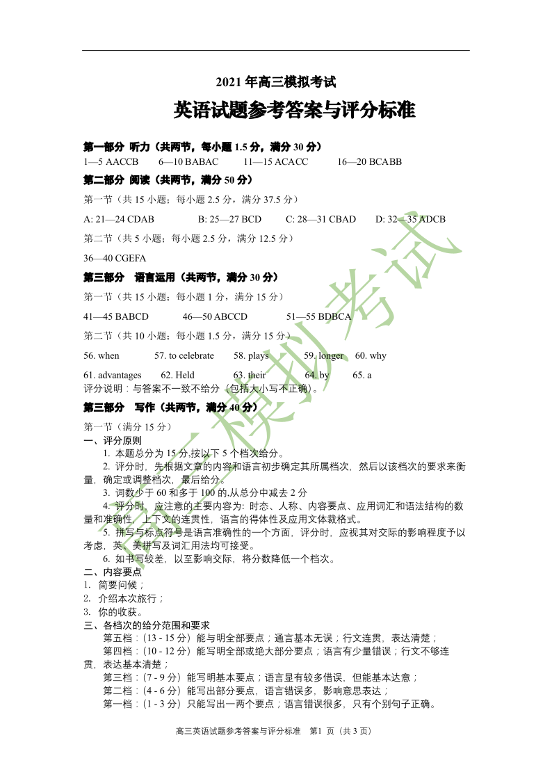 山东省九地市2020.12高三年级阶段性检测英语答案
